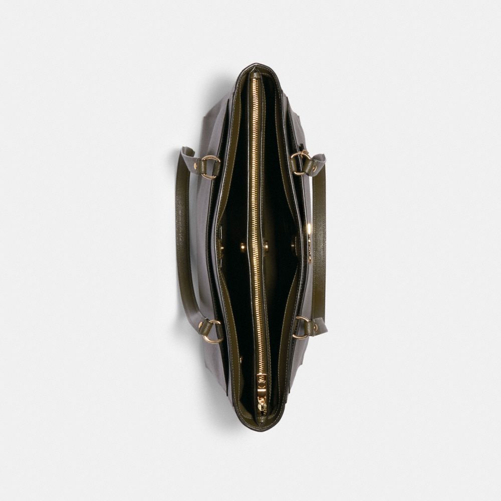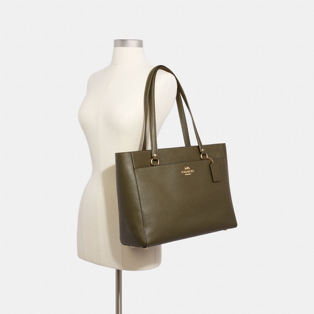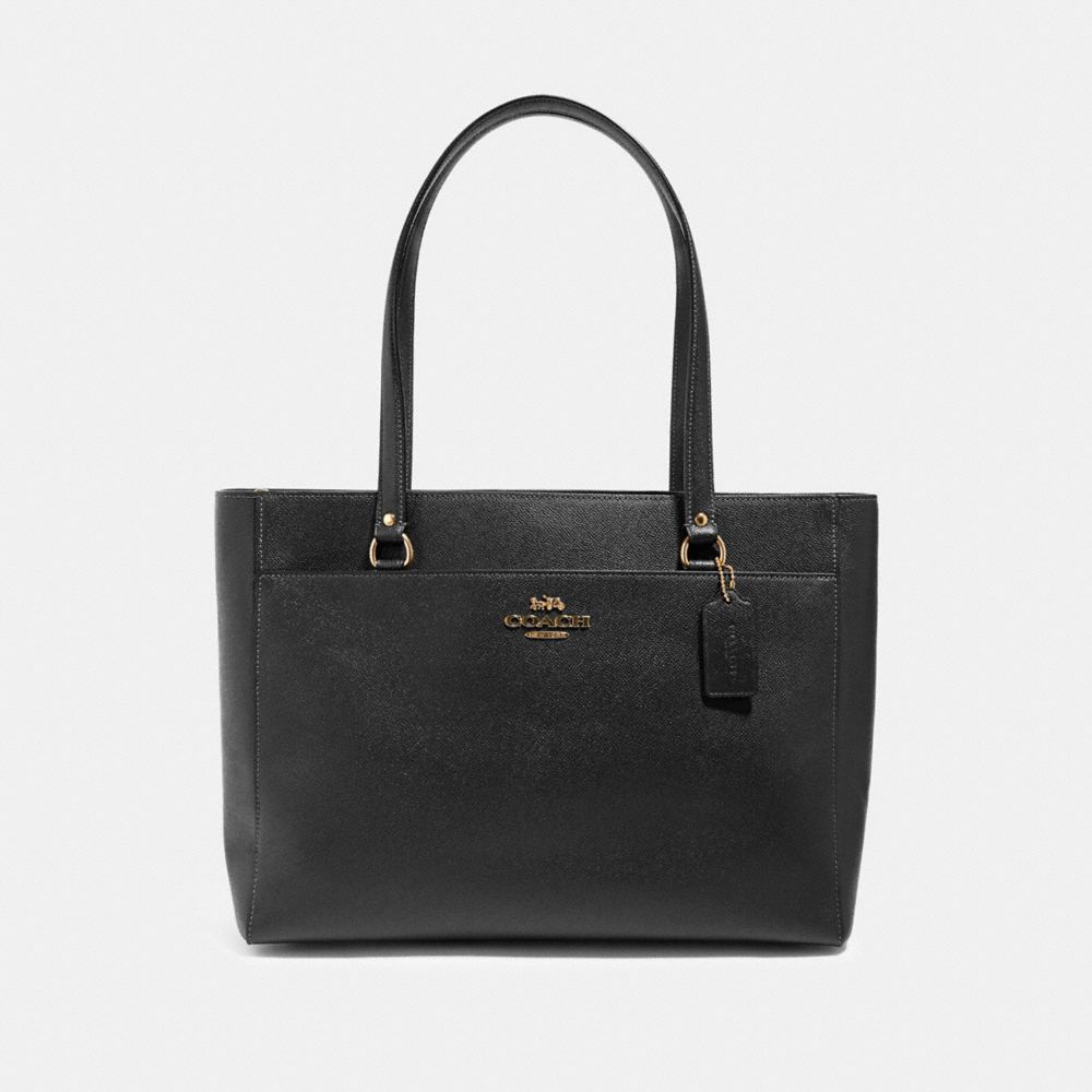 Crossgrain leather| Two credit card slots| Inside zip, cell phone and multifunction pockets| Center zip compartment| Snap closure, fabric lining| Handles with 10 1/2" drop| Outside slip pockets| 14 1/2" (L) x 11" (H) x 5 1/2" (W)