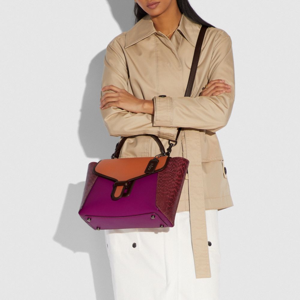 Glovetanned leather and genuine snakeskin| Inside zip and snap pockets| Slide tab and zip closures, fabric lining| Top handle with 4 1/4" drop| Outside snap pocket| Detachable strap with 21 1/2" drop for shoulder or crossbody wear| Four protective feet at base| 14 1/4" (L) x 8 1/2" (H) x 6 1/4" (W)