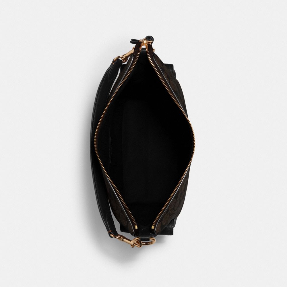 Signature coated canvas and refined pebble leather| Inside zip pocket| Zip-top closure, fabric lining| Detachable handle with 7" drop| Outside zip and snap pockets| Detachable strap with 20 3/4" drop for shoulder or crossbody wear| 10 3/4" (L) x 11 3/4" (H) x 5 1/4" (W)