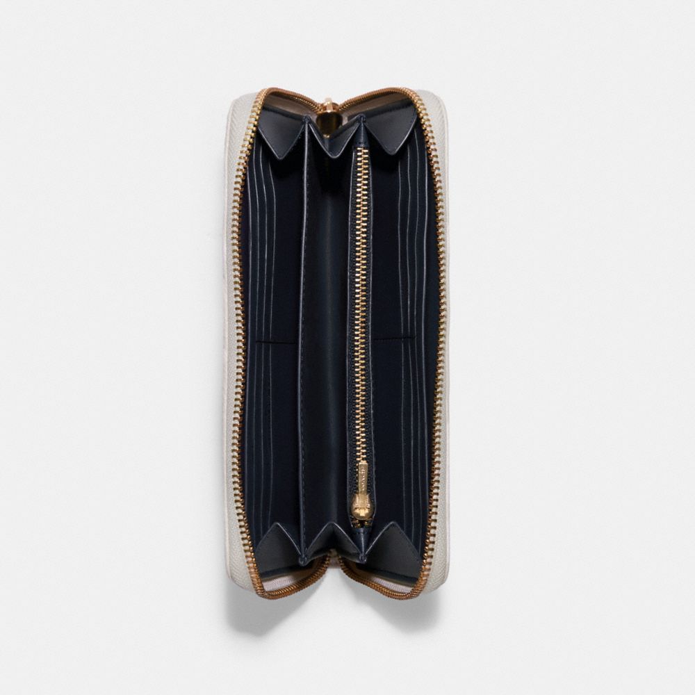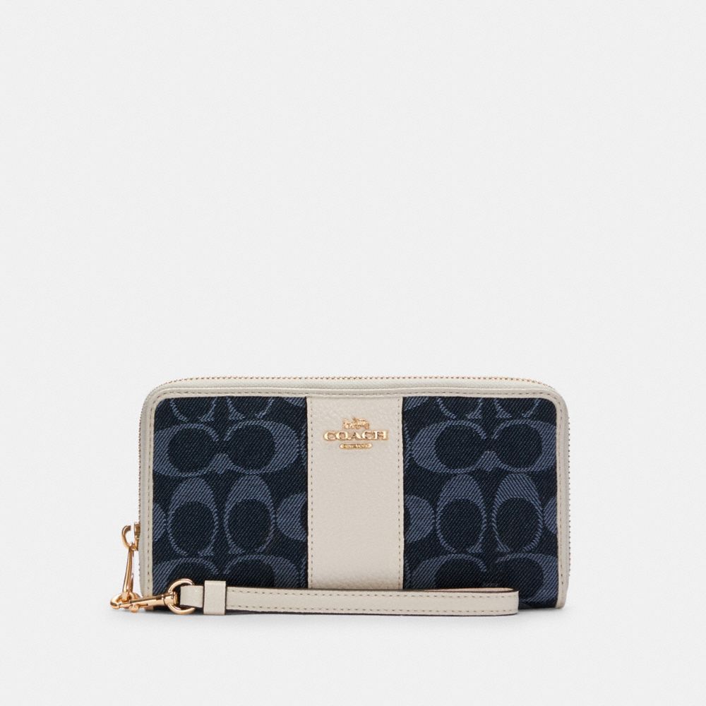Signature jacquard and refined pebble leather| Twelve credit card slots| Full-length bill compartments| Inside zip coin pocket| Zip-around closure| Detachable wrist strap| 7 1/2" (L) x 4" (H) x 1" (W)