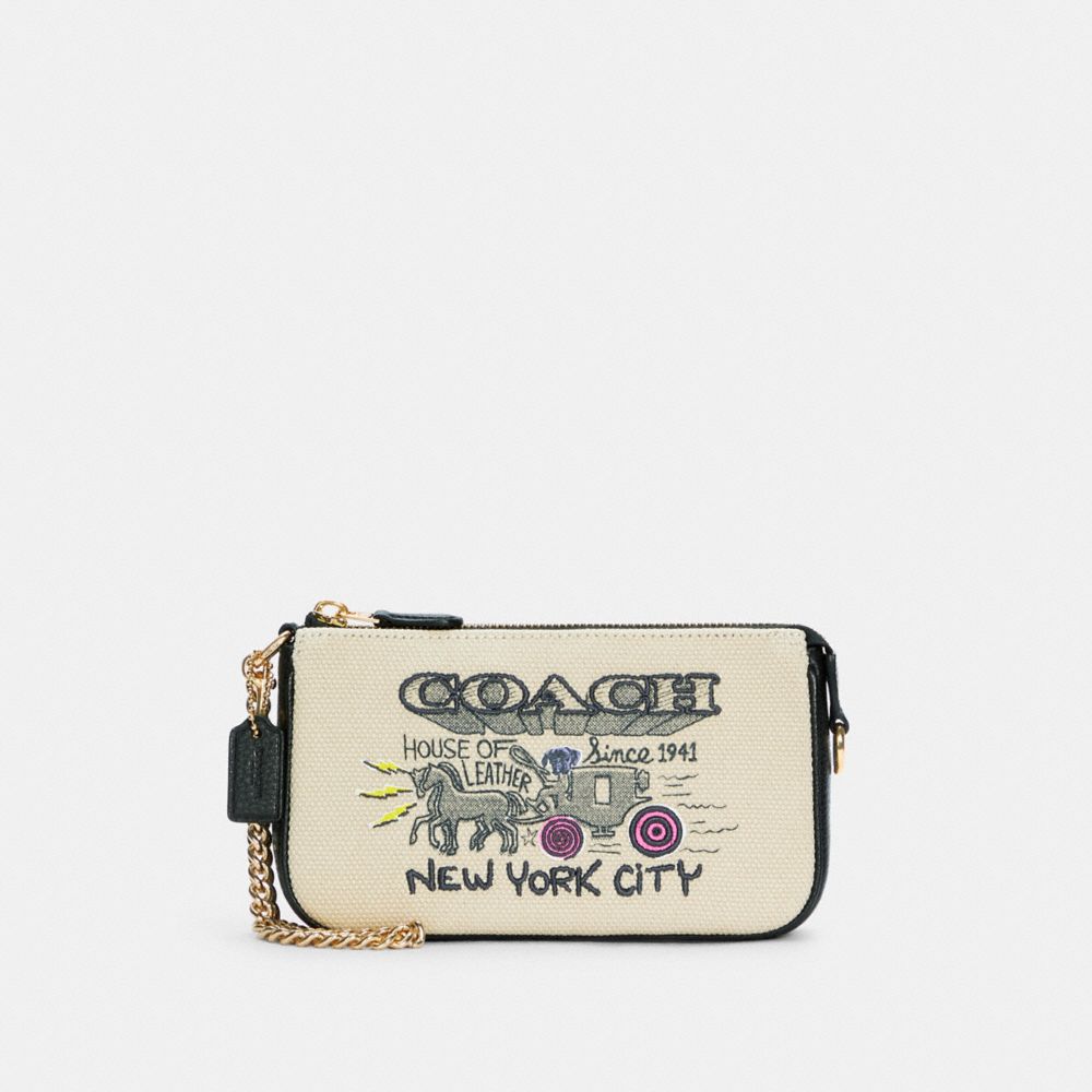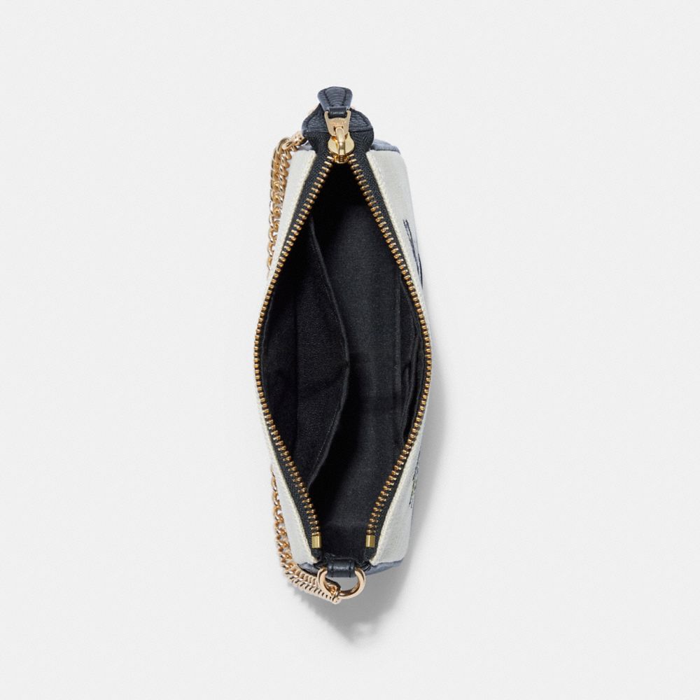 Canvas and refined pebble leather| Two credit card slots| Inside multifunction pocket| Zip-top closure, fabric lining| Strap with clip to form a wrist strap or attach to the inside of a bag| 7 1/2" (L) x 4 1/2" (H) x 2" (W)