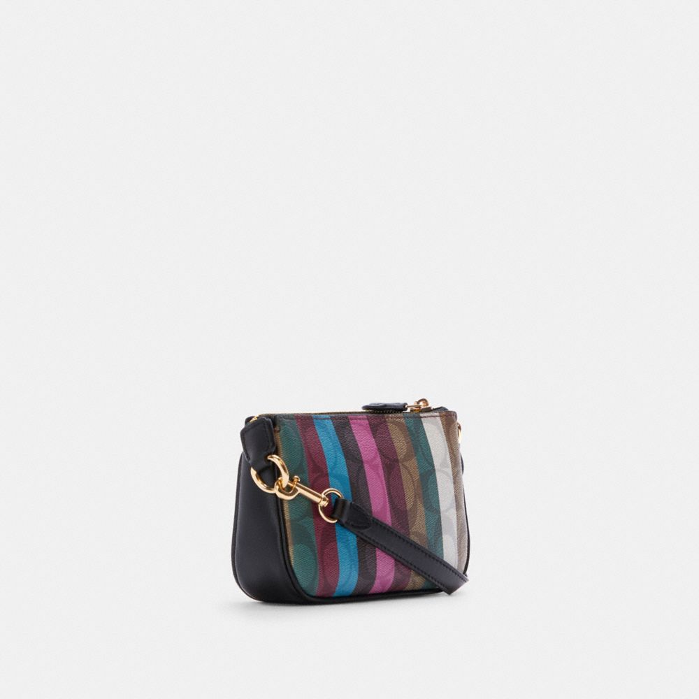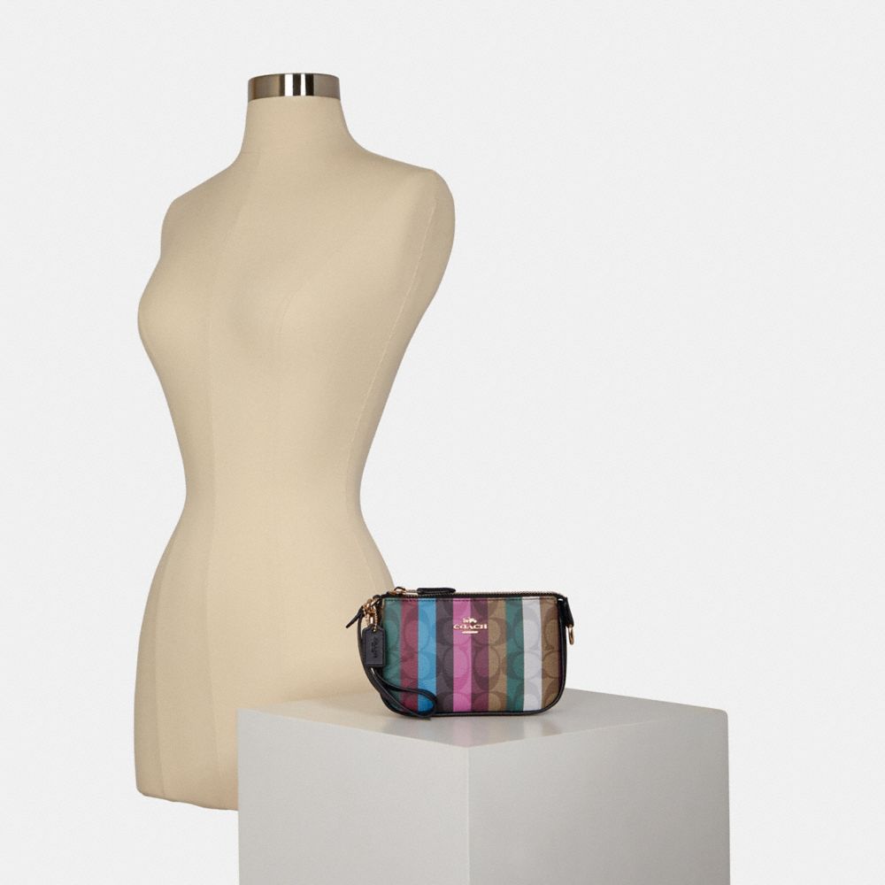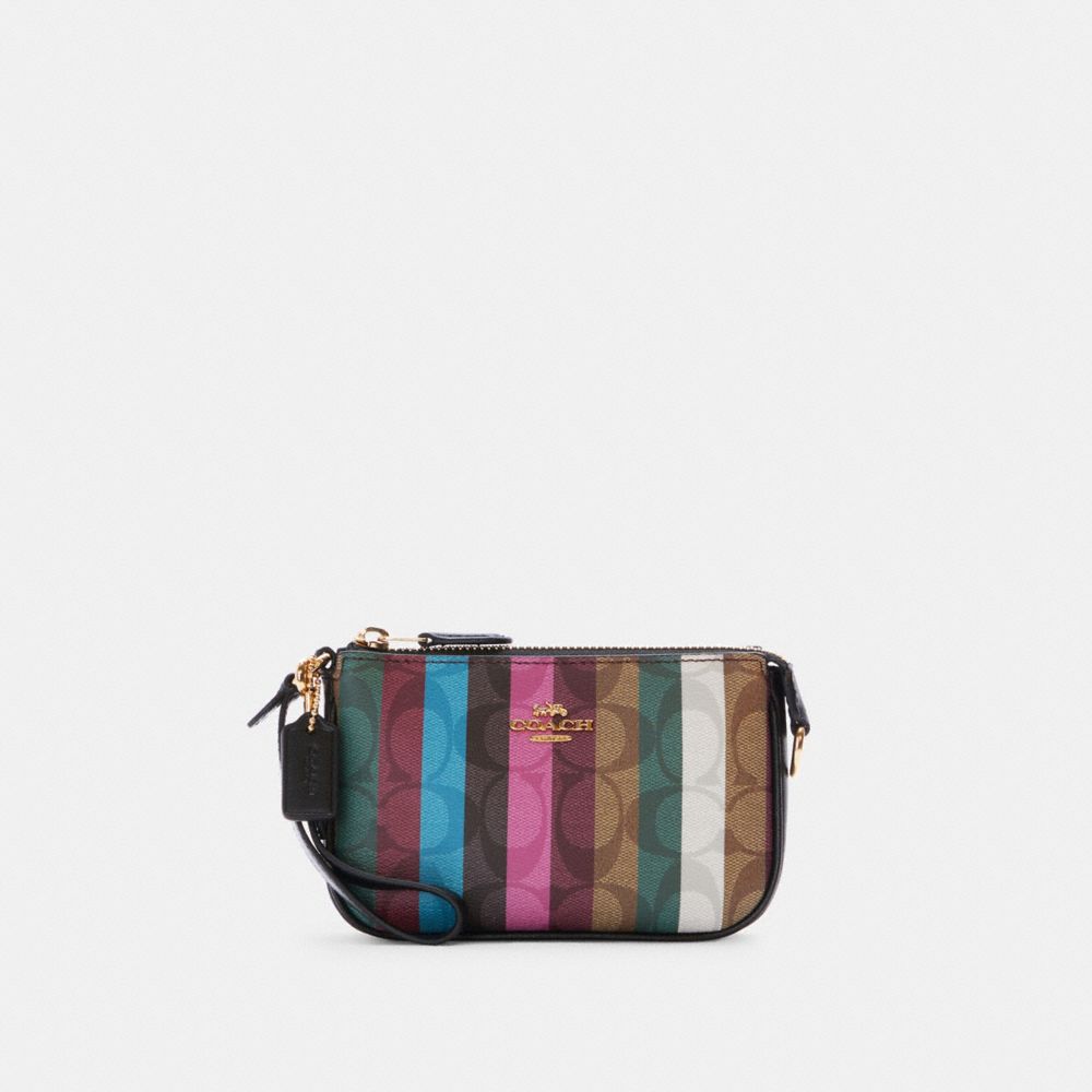 Signature coated canvas and smooth leather| Two credit card slots| Zip-top closure, fabric lining| Handle with 4 1/2" drop| 6" (L) x 4" (H) x 1 1/2" (W)Style No. C6021