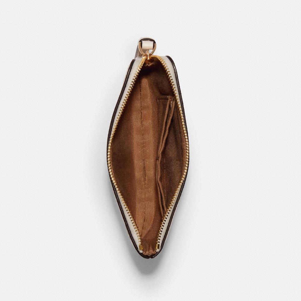 Printed coated canvas and smooth leather| Two credit card slots| Zip-top closure, fabric lining| Wrist strap attached| 6 1/4" (L) x 4" (H) x 1/2" (W)Style No. C7406