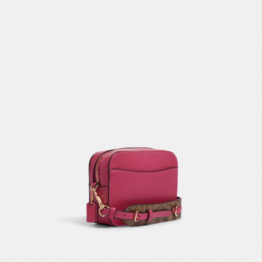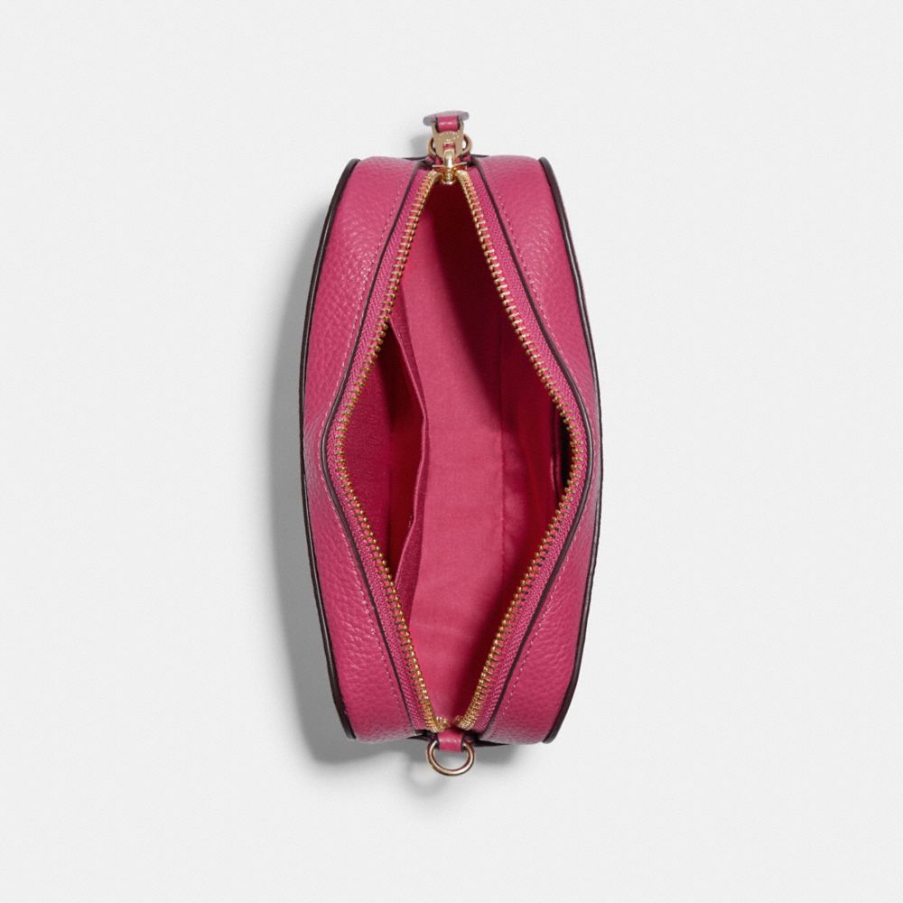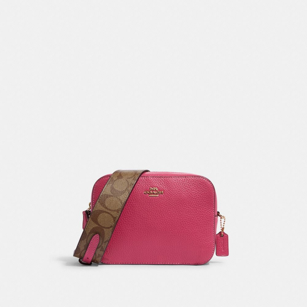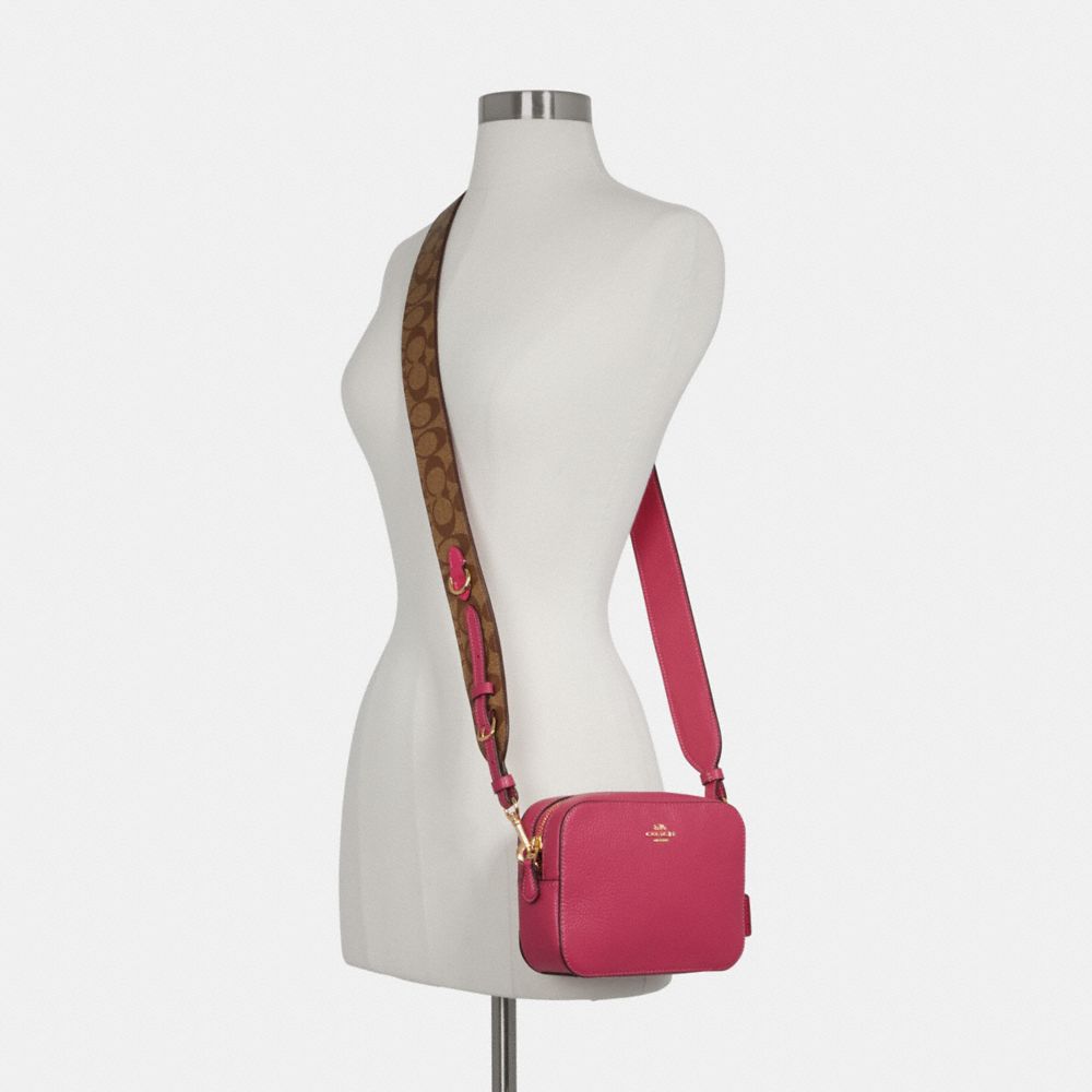 Refined pebble leather and Signature coated canvas| Two credit card slots| Inside multifunction pocket| Zip closure, fabric lining| Outside open pocket| Adjustable strap with 23" drop for shoulder or crossbody wear| 7 1/4" (L) x 5 1/4" (H) x 2" (H)Style No. C8375