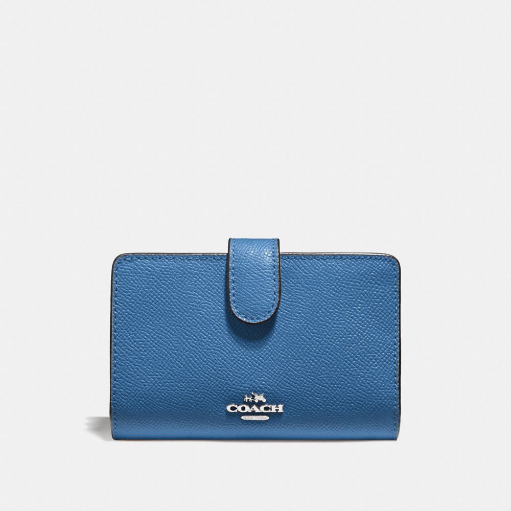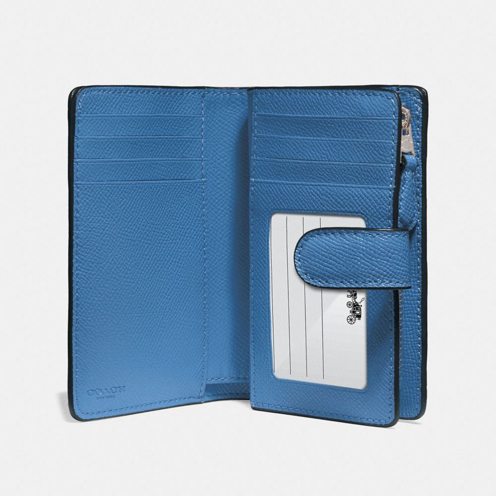Crossgrain leather| Seven credit card slots| Bill compartment| ID window| Zip pocket| Snap closure| 5" (L) x 3 1/2" (H) x 1/2" (W)
