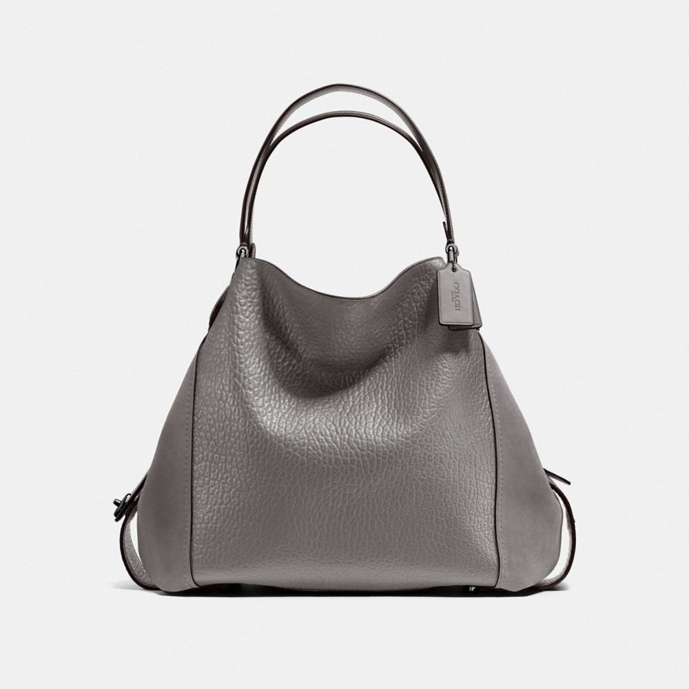 Buffalo-embossed leather, smooth leather and suede| Inside zip and snap pockets| Center zip compartment| Snap closure, fabric lining | Handles with 10 1/4" drop| 13 1/2" (L) x 12 1/4" (H) x 6 1/4" (W)