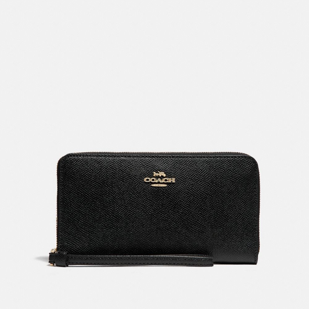 Crossgrain leather| Six credit card slots| ID window| Zip coin pocket| Inside phone pocket| Zip-around closure| Wrist strap attached| 7 1/4" (L) x 4" (H) x 3/4" (W)