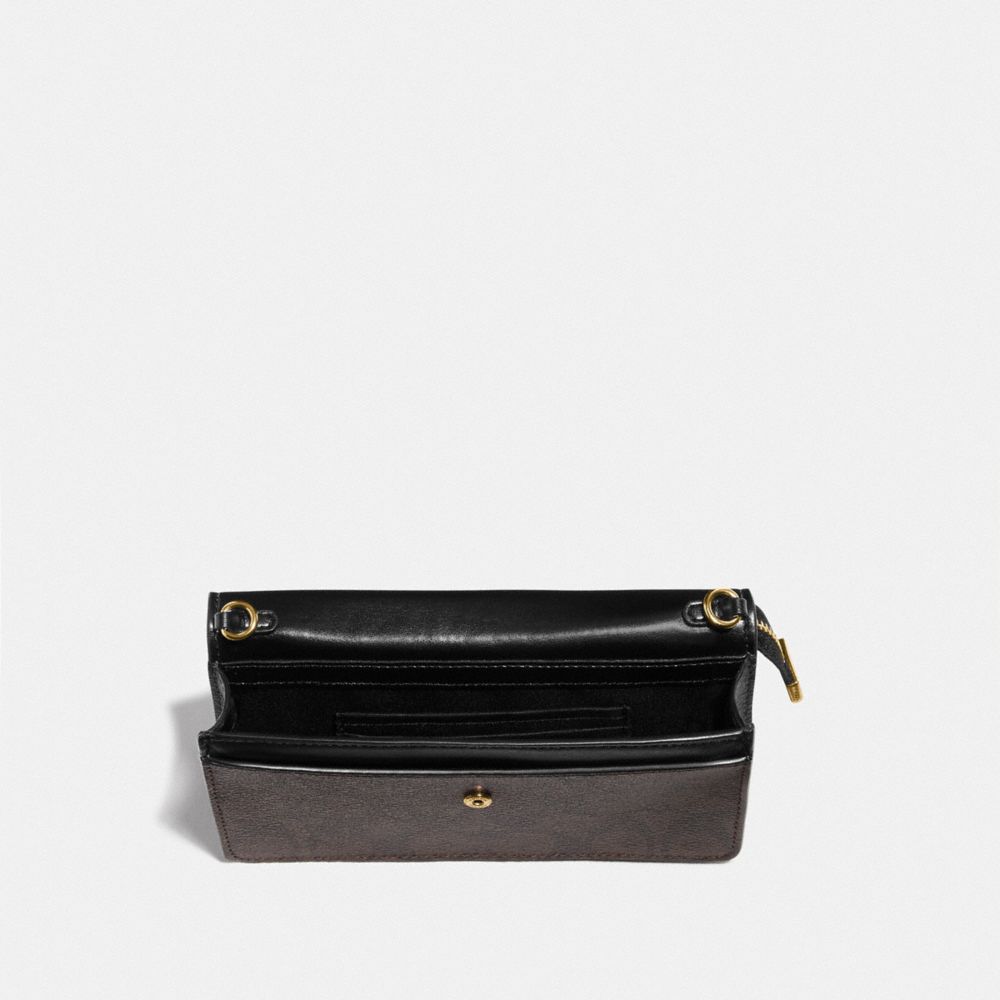 Signature coated canvas and smooth leather| One credit card slot| Snap closure, fabric lining| Outside zip pocket| Detachable wrist strap| 7" (L) x 4" (H) x 1 3/4" (W)