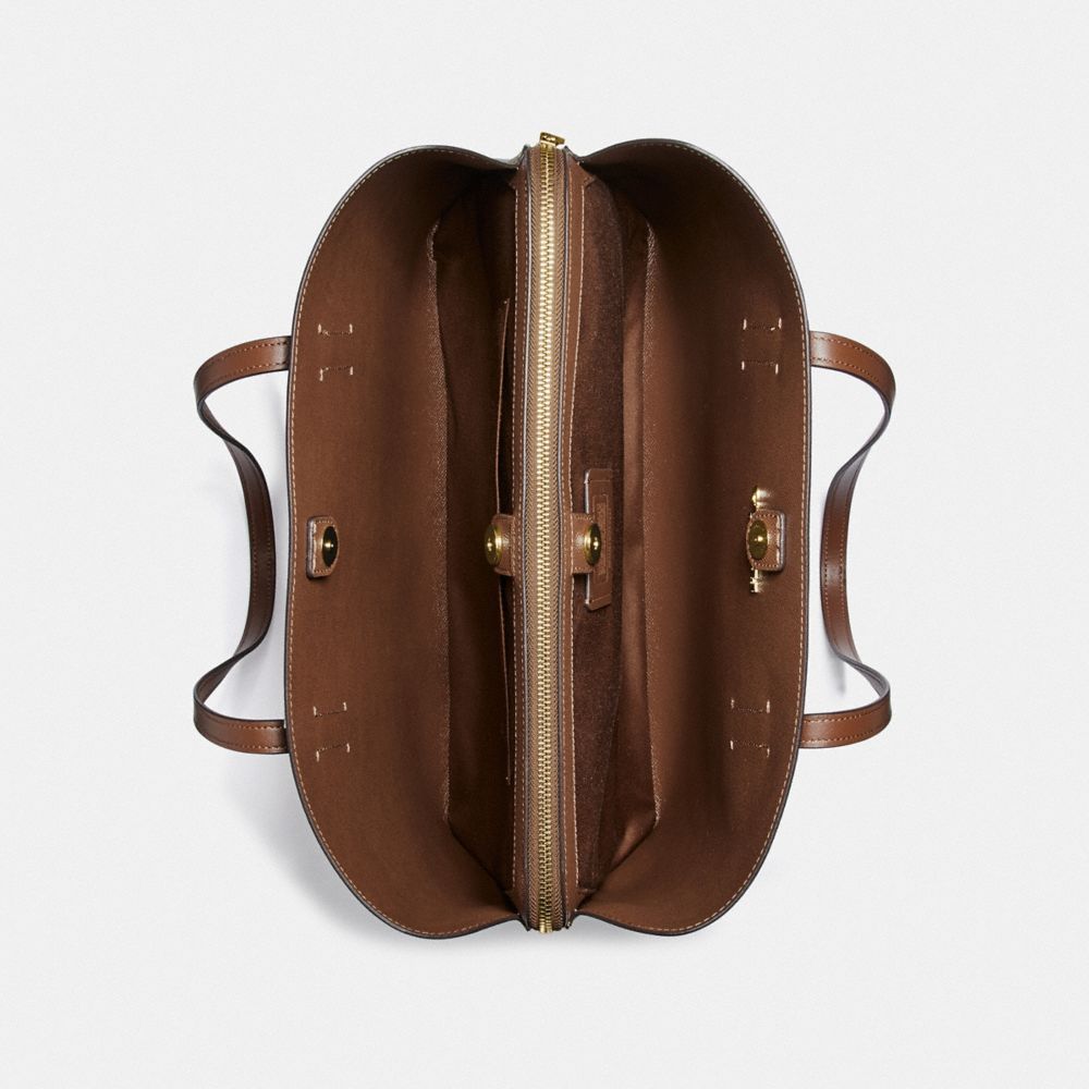 Signature coated canvas with smooth leather details| Inside multifunction pocket| Center zip compartment| Snap closure| Handles with 9" drop| 15 1/4" (L) x 10 3/4" (H) x 6" (W)
