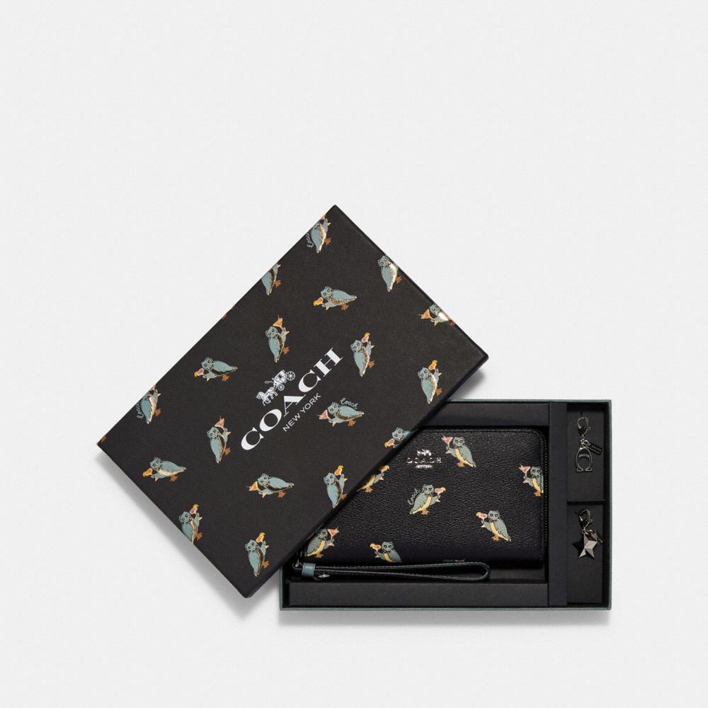 Printed coated canvas with smooth leather details| Six credit card slots| ID window| Zip coin pocket| Inside phone pocket| Zip-around closure| Wrist strap attached| 7 1/4" (L) x 4" (H) x 3/4" (W)| Packaged in a Coach gift box