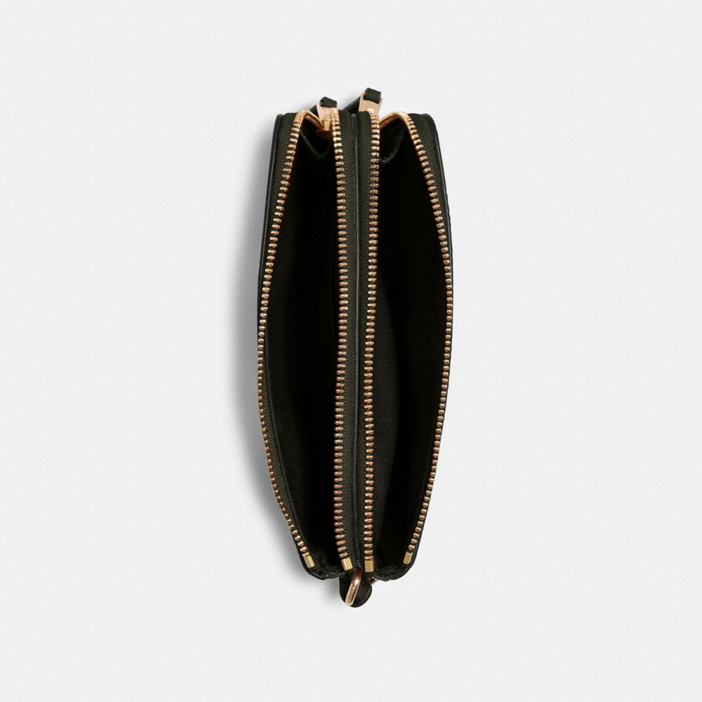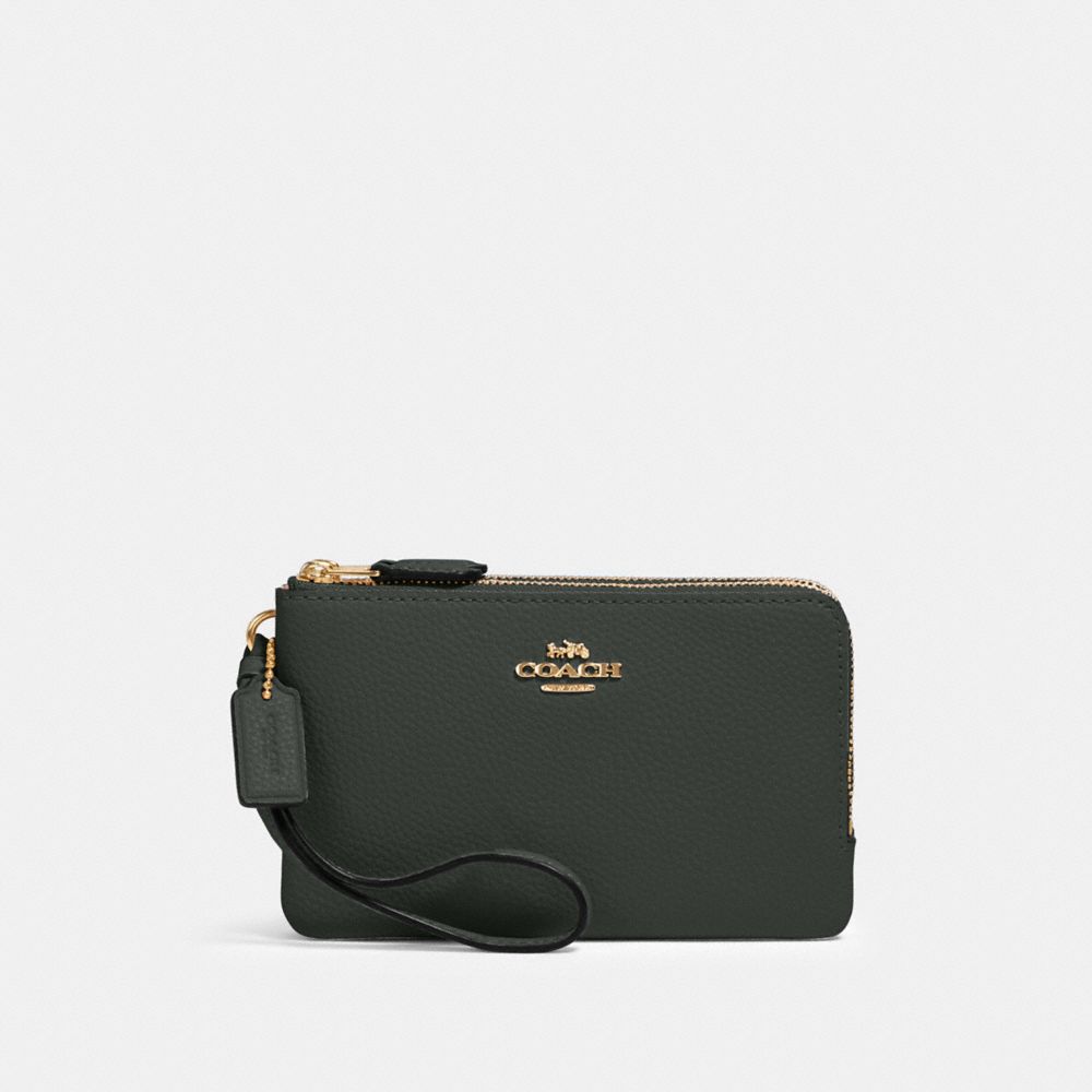 Polished pebble leather| Two credit card slots| Double zip closure, fabric lining| Wrist strap attached| 6 1/2" (L) x 3 3/4" (H) | Fits an iPhone or Android