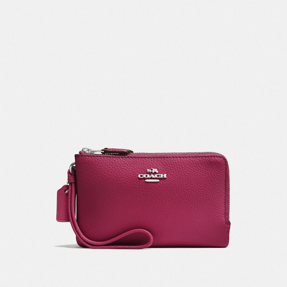 Polished pebble leather| Two credit card slots| Double zip closure, fabric lining| Wrist strap attached| 6 1/2" (L) x 3 3/4" (H) | Fits an iPhone or Android