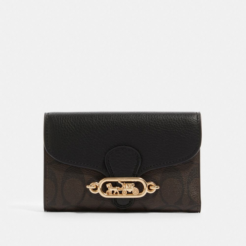 Signature coated canvas and refined pebble leather| Four credit card slots| Bill compartment| Inside zip coin pocket| Snap closure| Outside open pocket| 6" (L) x 3 3/4" (H) x 3/4" (W)