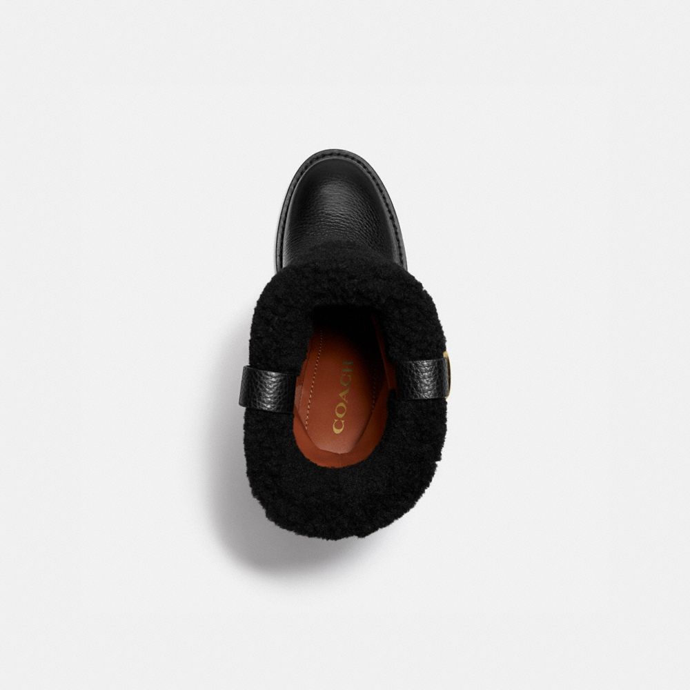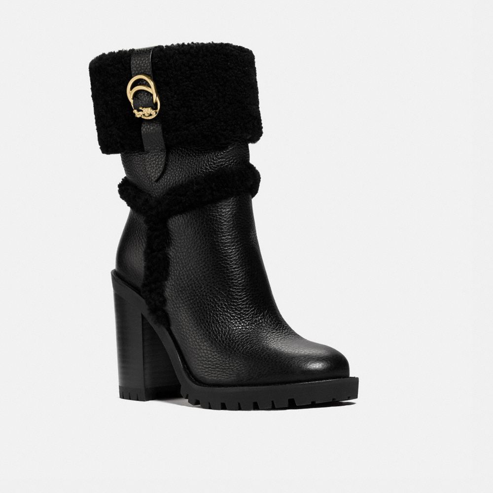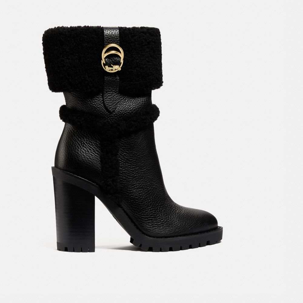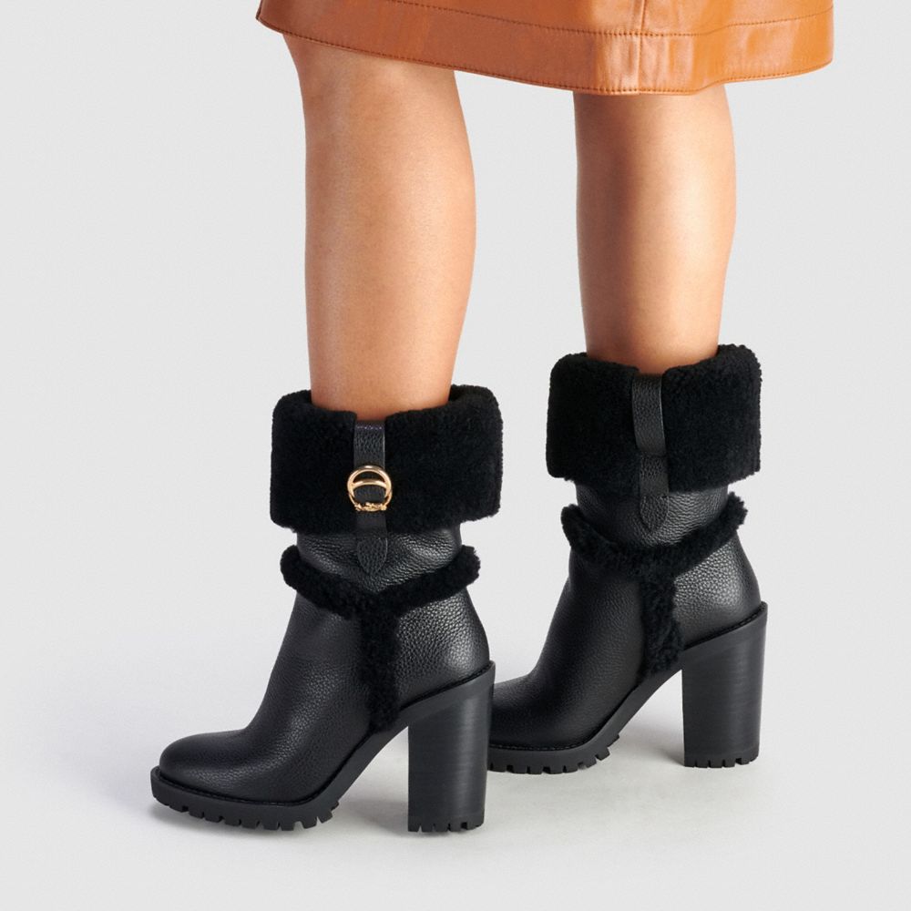 Leather and shearling upper| Man-made leather lining and footbed| Rubber outsole| Pull on| Shaft: 7" height, 13 3/4" circumference| 3 1/2" heel